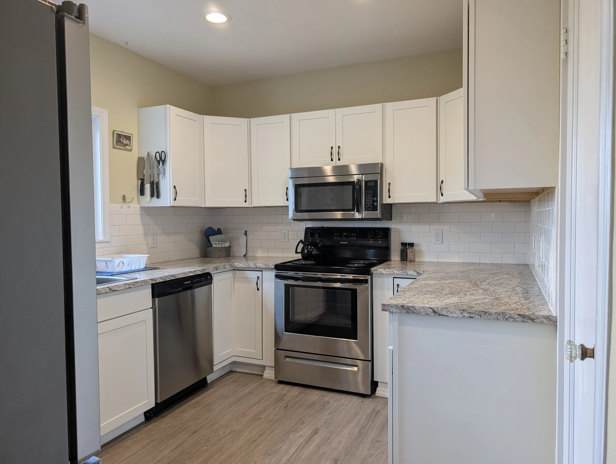 Spacious kitchen: fridge, microwave, dishwasher, basic cookware, plates, utensils, and drip coffee maker
