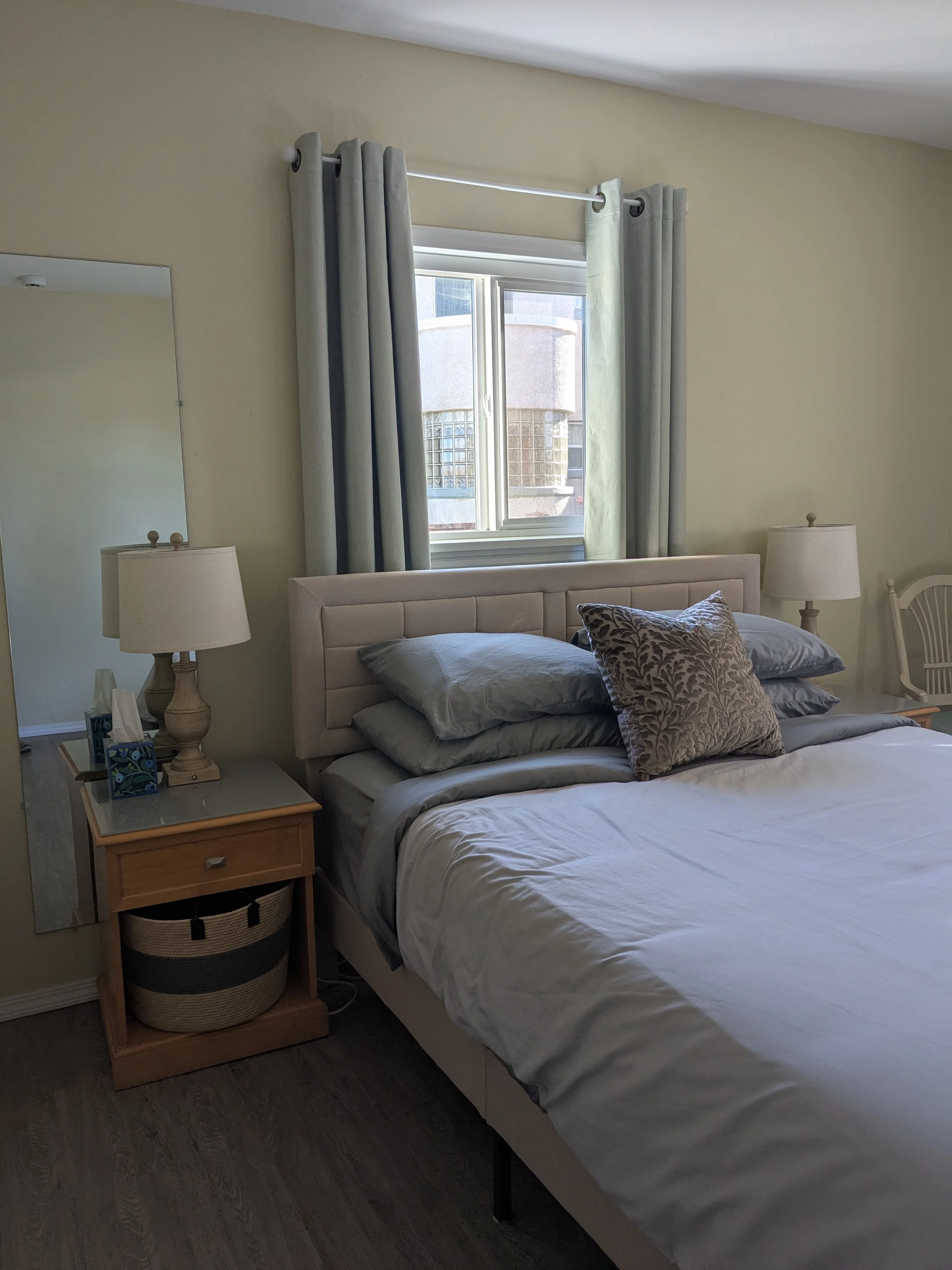 Private bedroom with queen bed, linens, and pillows